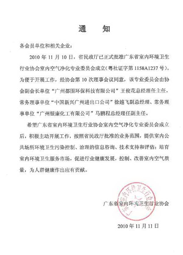 據(jù)廣東省室內(nèi)環(huán)境衛(wèi)生行業(yè)協(xié)會2010年11月11日通知,我司總經(jīng)理馬鵬程先生擔任廣東省室內(nèi)環(huán)境衛(wèi)生行業(yè)協(xié)會室內(nèi)空氣凈化專業(yè)委員會副主任一職。 通知內(nèi)容如下: