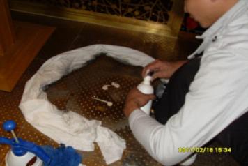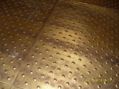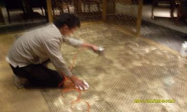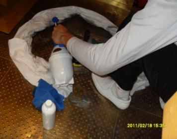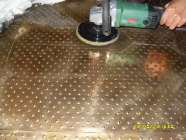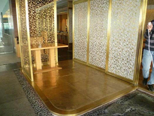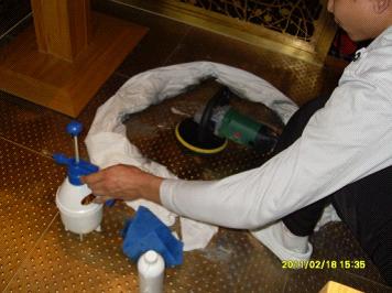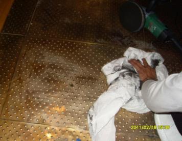 工程名稱:灘萬餐廳銅地板抗氧化處理 施工地點:香格里拉酒店三樓灘萬餐廳大廳及包房銅地板區域 施工時間:2011年2月19日至22日凌晨(非營業時段) 一 施工準備 場地保護:因施工打磨時會產生少量揚塵和濺沫,故用舊布圍住四周作好防護,減輕對非工作區域的影響。 二、施工現場的圖片 涂抹磨砂膏 打磨拋光 噴灑清水輔助清潔和散熱 抹布擦干 再次打磨拋光 烘干地板 噴涂銀康光觸媒304系列產品 三、處理前后效果對比 處理前 處理后